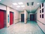 この施設は河川と高速道路に挟まれた細長い敷地に建っています。敷地の形状に合わせ建物も細長いためエレベーターを建物の中心に配置し左右に分けて療養室などを設けました。療養室は入所者の快適性を重視するため、1ベッド当たり1つの窓を設けることを基本とした部屋の造りとなっています。